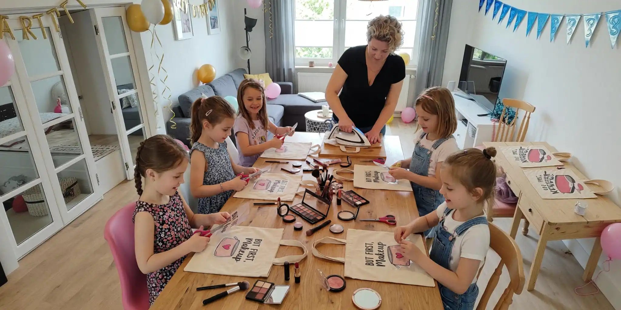 Geburtstagsparty-Set Makeup bunt mit Taschen - 6 x DIN A4 + 5 Baumwolltaschen