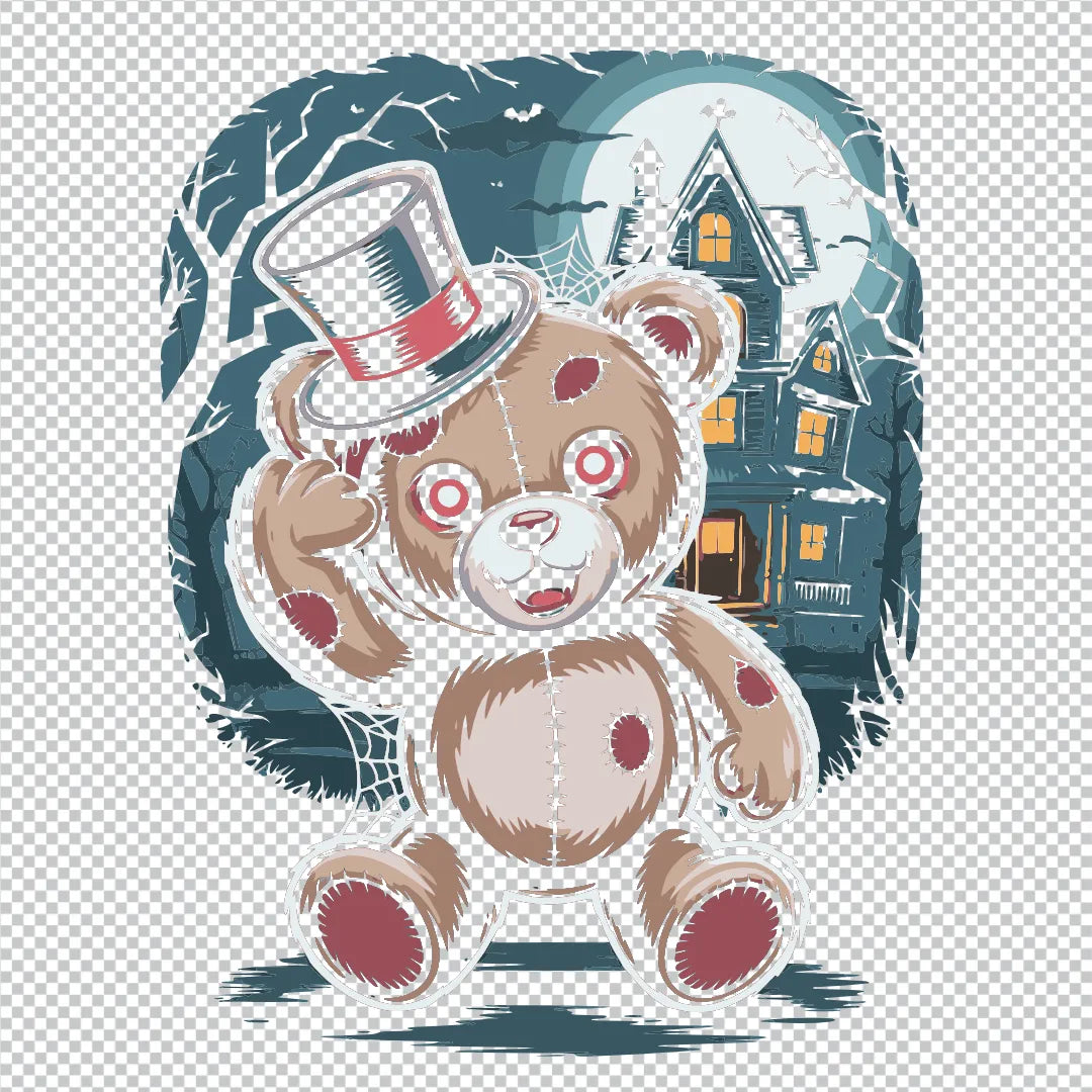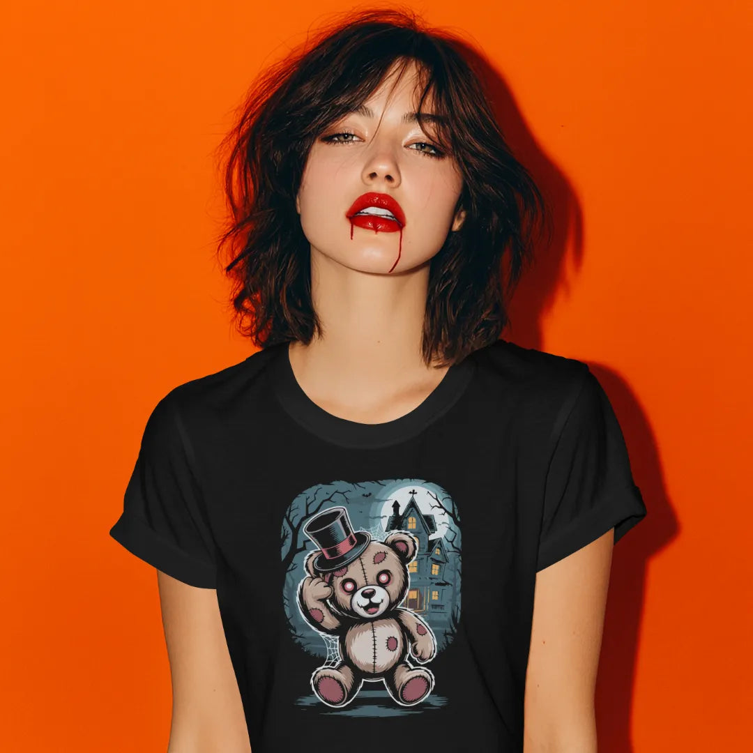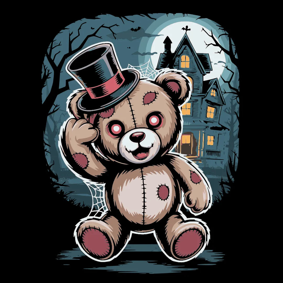 Das aufwändig designte Motiv zeigt einen klassischen Teddybären, der schon bessere Tage gesehen hat. Mit seinem schiefen Zylinder und den kunstvollen Flicken wirkt er liebenswert schräg und passt perfekt vor die Kulisse eines geheimnisvollen Gruselschlosses unter einem unheimlichen Vollmond. Dieses Design erzählt eine kleine Geschichte und ist ein absoluter Hingucker!