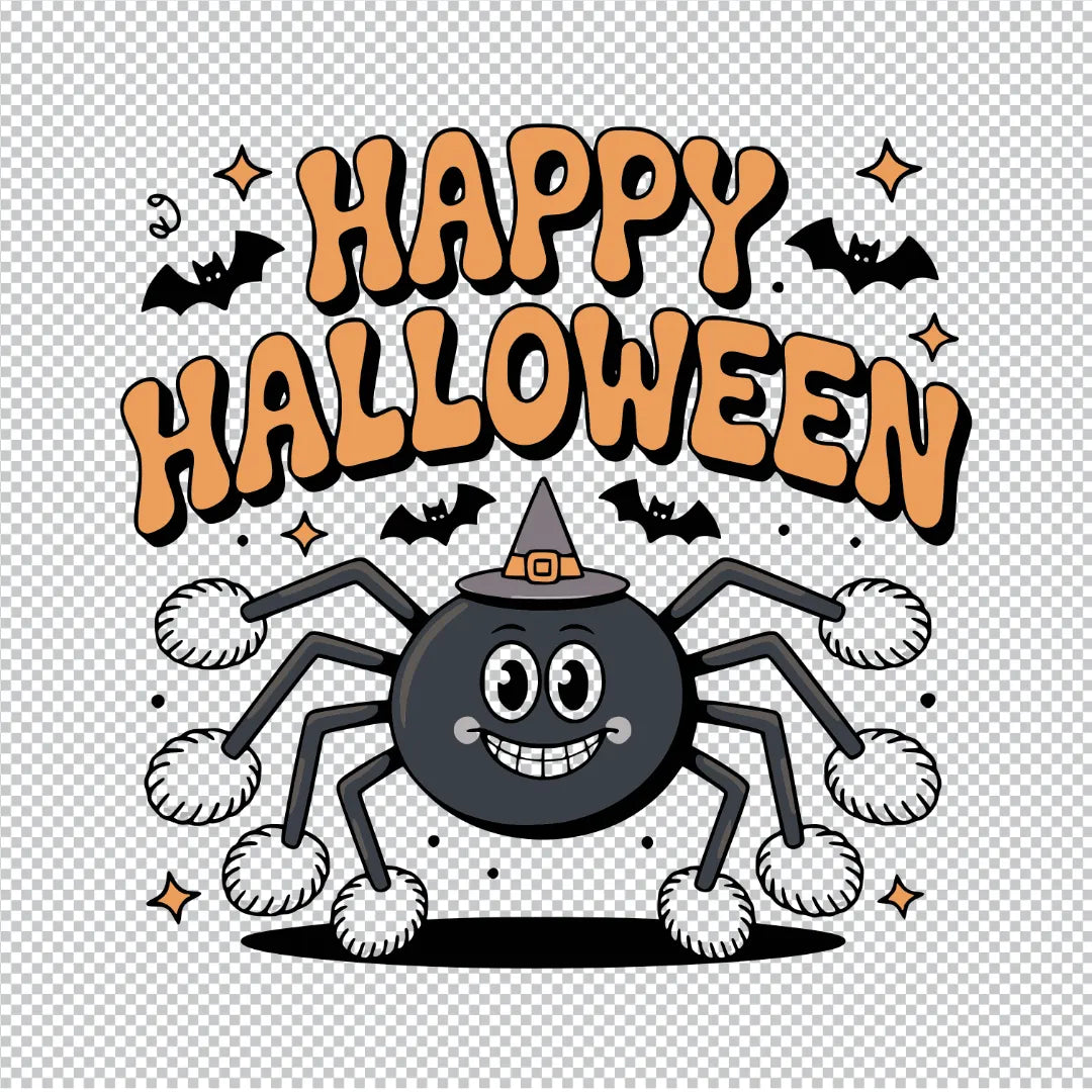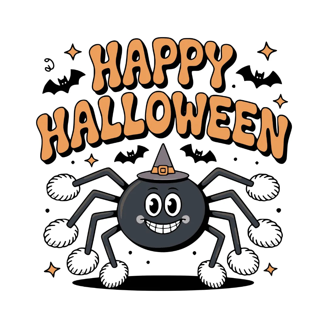 Diese entzückende Bügelfolie (DTF: Direct-to-Film) macht aus Angstmachern liebenswerte Freunde! Das Motiv zeigt eine lächelnde Spinne mit flauschigen Puscheln an den Füßen, freundlichen Kulleraugen und einem sanften Grinsen – kombiniert mit dem fröhlichen Spruch "Happy Halloween". Perfekt für Kinder, die Halloween kunterbunt und ohne Gruselfaktor feiern möchten!