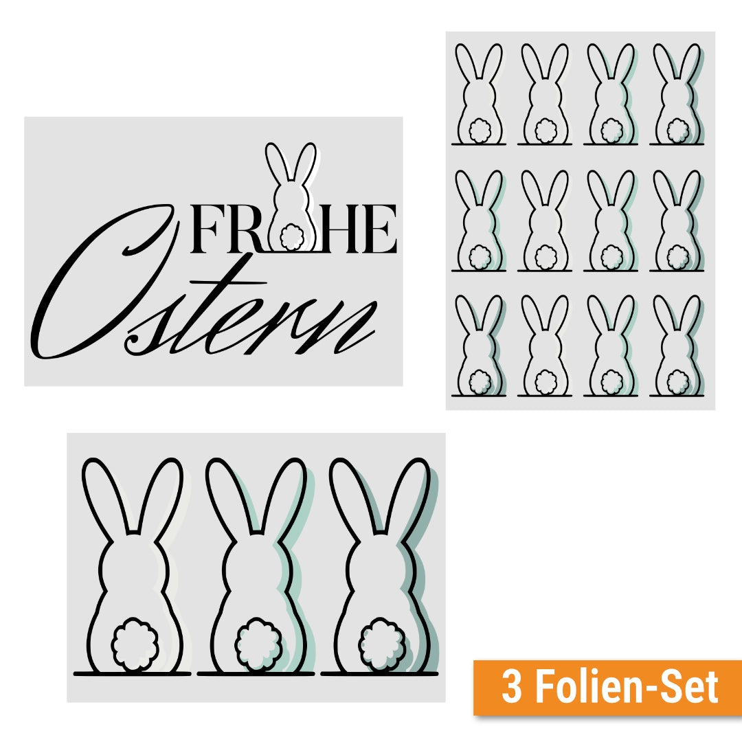 - „Frohe Ostern“ Schriftzug kombiniert mit den rückwärtigen Hasen – perfekt als Highlight-Motiv.