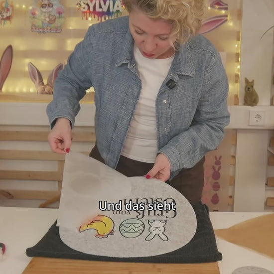 Verleihe deinen Textilien im Handumdrehen einen frühlingshaften Oster-Look! Mit diesem liebevoll gestalteten Bügelbilder-Set bringst du mit der Blume des Hasen Ostergrüße stilvoll auf Shirts, Kissenhüllen, Stoffbeutel, Tischläufer oder Untersetzer.
